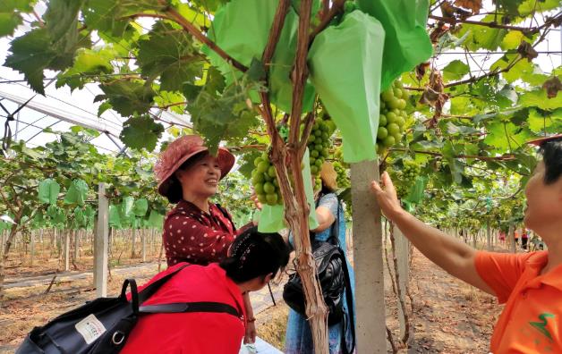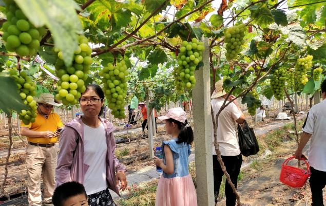 走进汉光超顺,就被浓浓的瓜果香气包围着的,眼前是一排排整齐的葡萄架,晶莹饱满的葡萄果实挂满了枝头,散发着浓郁的果香,令人垂涎欲滴。“汉光超顺的葡萄很靓吃,我们每年都来,今年推出的阳光玫瑰这个品种,也令人很惊喜,多汁又甜,小孩很喜欢。”来自五华县安流镇的游客张志军说到,每年这个时候,他都会携家带口来体验采摘乐趣,再把一袋袋的葡萄、无花果高高兴兴拎回家。
