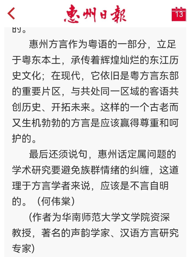 但是令人欣慰的,惠州话归粤派并没有消失,还在坚持。今年7月份,由政协广东省惠州市委员会编著的《惠州方言词典》发行,华南师范大学文学院教授何伟棠在序言重申“我们是深信其为粤语而决不可能归属客家话的。它是虽受客语辐射磨损而东江粤语本土特质依旧非常显著的粤方言。”