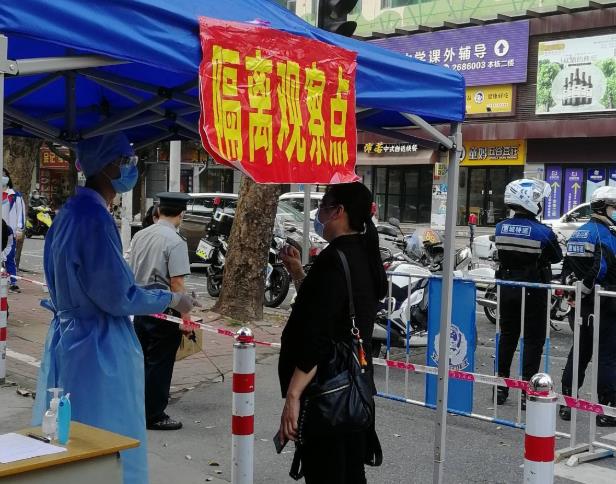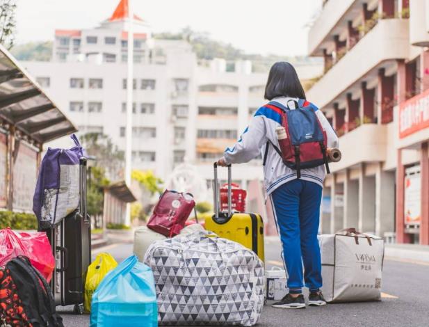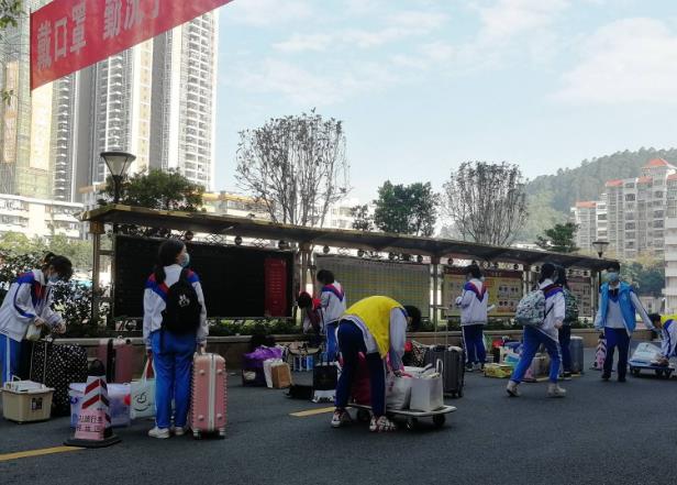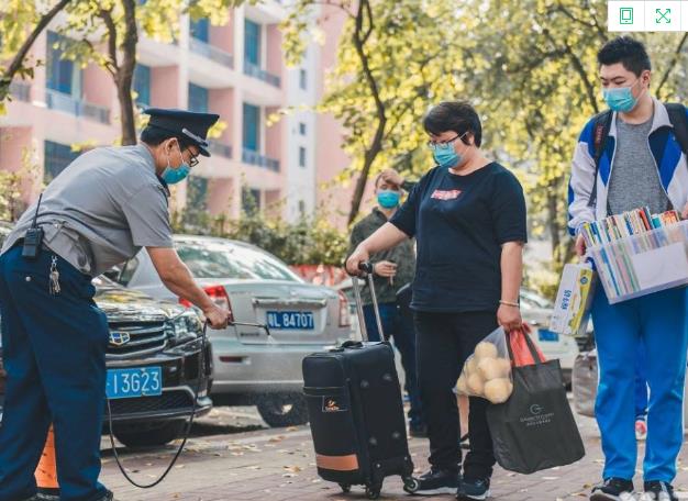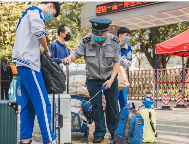 学生陆续带着行李返校,门口挂着的防疫标语清晰可见